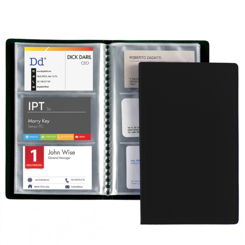 Portabiglietti da visita a 3 tasche, realizzate in PP con copertina nera opaca flessibile, 20 fogli fissi saldati sul dorso (60 biglietti). Tasche 6x10cm cadauno. Formato esterno: 12,5x 20,5cm. Made in Italy