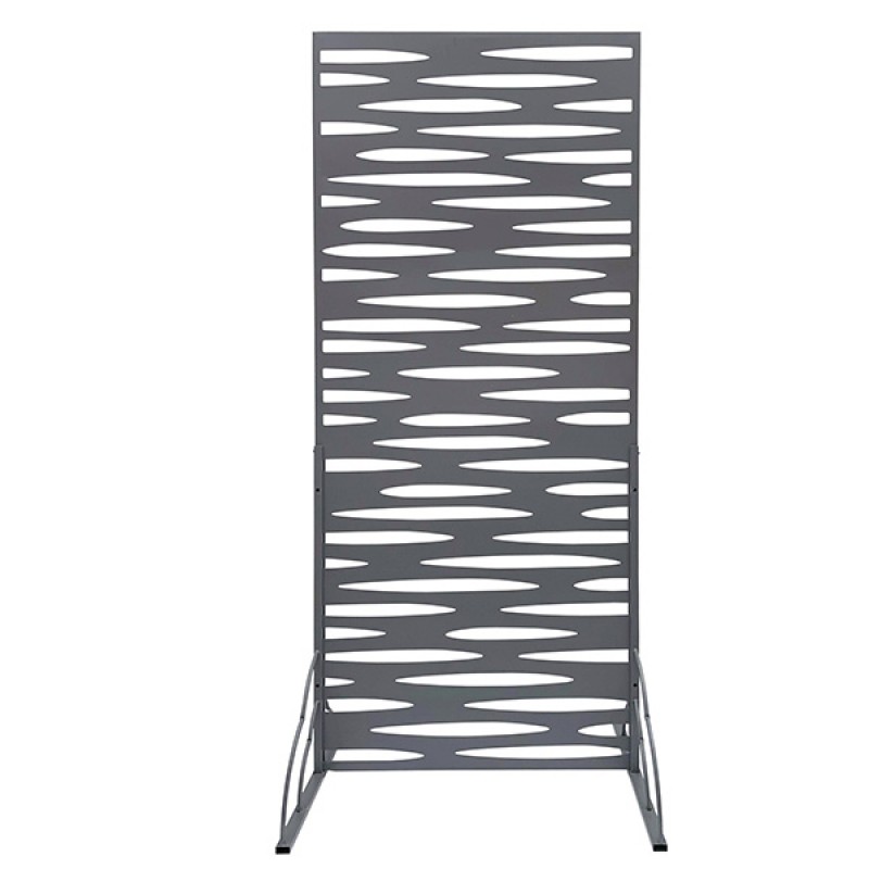 Pannello decorativo verticale in metallo, con design minimale ed elegante, completo di due piedi laterali per garantire stabilità su pavimenti piani. Adatto per ambienti interni ed esterni, può essere utilizzato come elemento decorativo o divisorio. Dimensioni: 80x180cm. Confezione inclusa con 4 bulloni, 4 dadi e la chiave per serraggio bulloni.