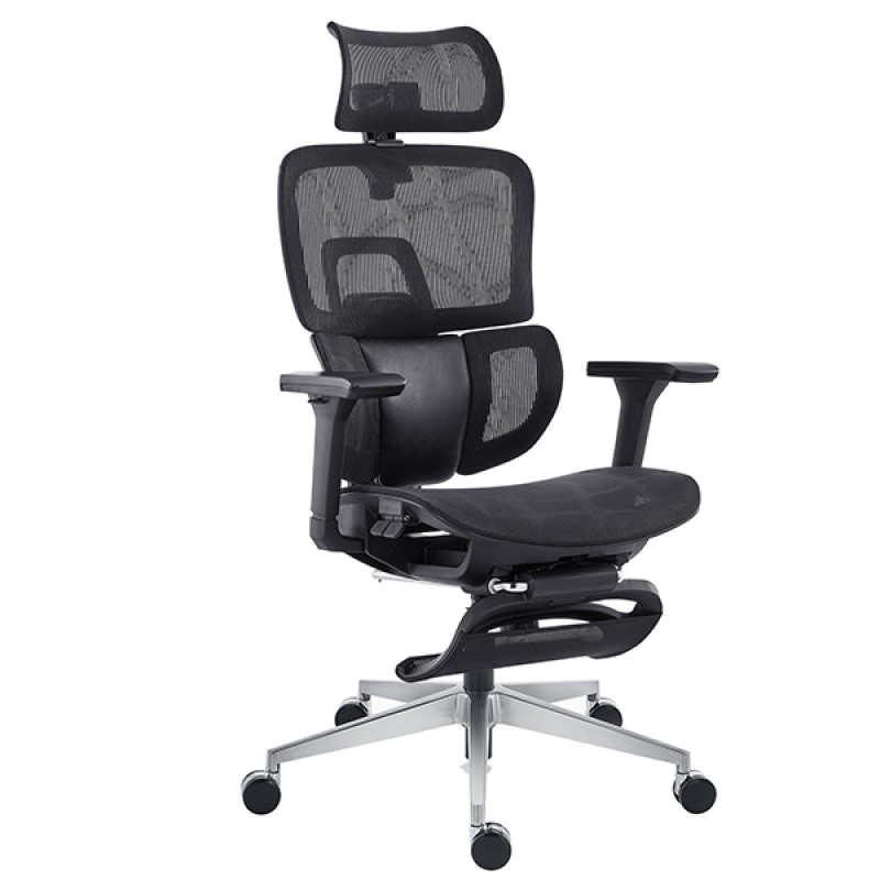 Seduta ergonomica rete autoportante full. Elevazione a gas, supporto lombare dinamico elastico contatto permanente, meccanismo synchro con 4 blocchi regolazione peso antishock, traslatore. Gas certificato TUV; DL 81; UNI EN 1335 B. Portata massima 150kg. Braccioli inclusi. Poggiagambe retrattile in rete. Base in alluminio. Dimensioni: Altezza totale: 116-126cm; Profondità: 70cm; Altezza seduta da terra: 42-52cm; Larghezza sedile: 52cm (65cm con braccioli); Profondità sedile: 45-55cm; Altezza schienale: 75cm; Larghezza schienale: 50cm; Altezza braccioli da terra: 60-70cm; Base Ø 70cm.