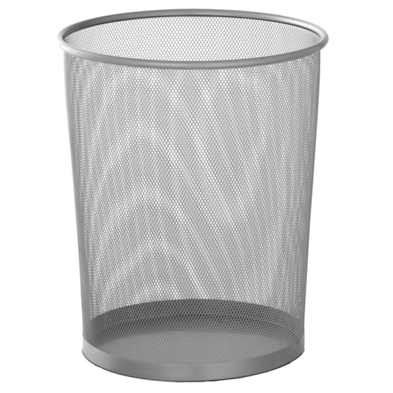 Cestino gettacarte tondo in metallo traforato colore argento. Dimensioni: diametro 29cm - altezza 34cm.