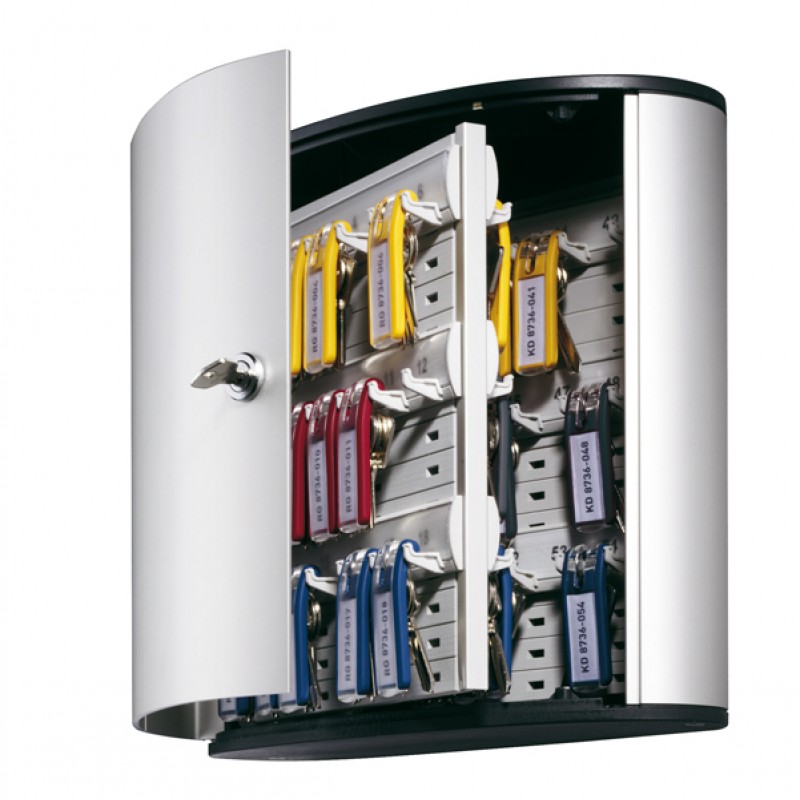 CASSETTA PORTACHIAVI DA MURO, REALIZZATA IN ALLUMINIO CON CAPACITÀ DI 54 CHIAVI. LO SPORTELLO SI APRE A PIÙ DI 90° PER FACILITARE L'ACCESSO ALLE CHIAVI. CHIUSURA CON SERRATURA E 2 CHIAVI NUMERATE CHE POSSONO ESSERE SOSTITUITE IN CASO DI PERDITA O ROTTURA. I PARTICOLARI PANNELLI INTERNI PERMETTONO ALLE BARRE PORTACHIAVI DI ESSERE AGGANCIATE ALL'ALTEZZA DESIDERATA ASSICURANDO UN'ALTA VERSATILITÀ DI GESTIONE. INCLUDE 6 PORTACHIAVI 1957 IN COLORI ASSORTITI. DIMENSIONI: 30,2X28X11,8CM.