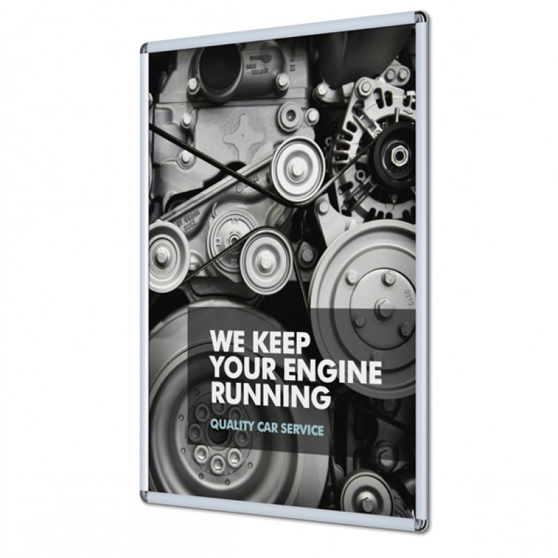 Cornici a scatto con angolo arrotondato e protezione antiriflesso in PVC. Fondo in materiale plastico PS. Tutte le cornici sono utilizzabili sia in orizzontale che verticale. Formato 70x100cm - profilo 25mm. Kit per fissaggio a muro non fornito.