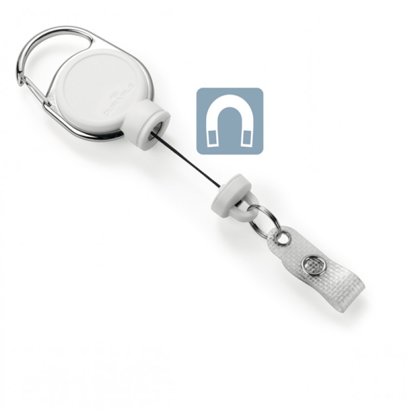 Chiocciola YO-YO per portabadge pesanti o chiavi. La chiusura magnetica supporta un peso fino a 300gr. Dotata di aggangio in metallo e di fascetta di aggancio con bottone a pressione, ancorata ad un piccolo anello in metallo. Cavo retrattile da 60cm. Il magnete integrato può compromettere la lettura delle tessere con banda magnetica.