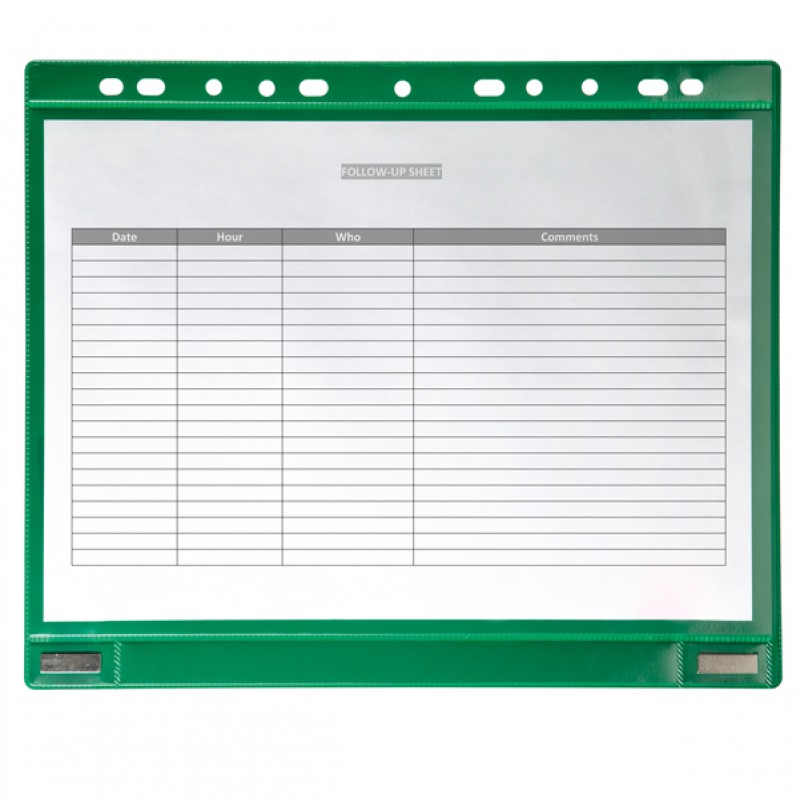 Buste perforate in PVC senza ftalati, estremamente resistenti e flessibili; colori ultravisibili, perforazione universale sul lato. Dotate di magneti extraforti che permettono di sfogliare le buste bloccandole in posizione verticale quando utilizzate con l'apposito supporto Djois 181110 o 181111. Dimensioni: A4 315x265mm. Colore verdi