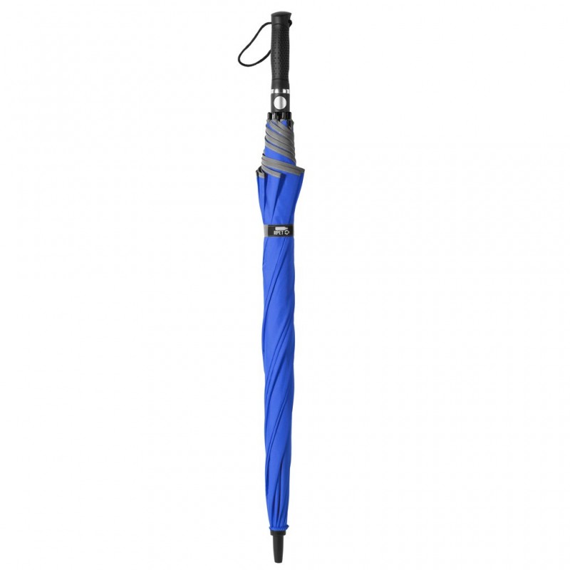 tessuto realizzato dal riciclo delle bottiglie in PET (RPET), struttura in fibra di vetro, puntale in plastica, manico rivestito in gomma, laccio da polso, apertura automatica. Con bordo catarifrangente BL (blu royal)