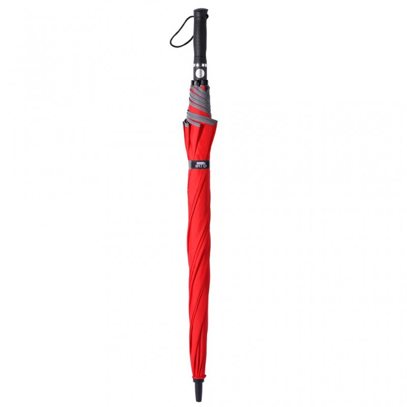 tessuto realizzato dal riciclo delle bottiglie in PET (RPET), struttura in fibra di vetro, puntale in plastica, manico rivestito in gomma, laccio da polso, apertura automatica. Con bordo catarifrangente R (rosso)