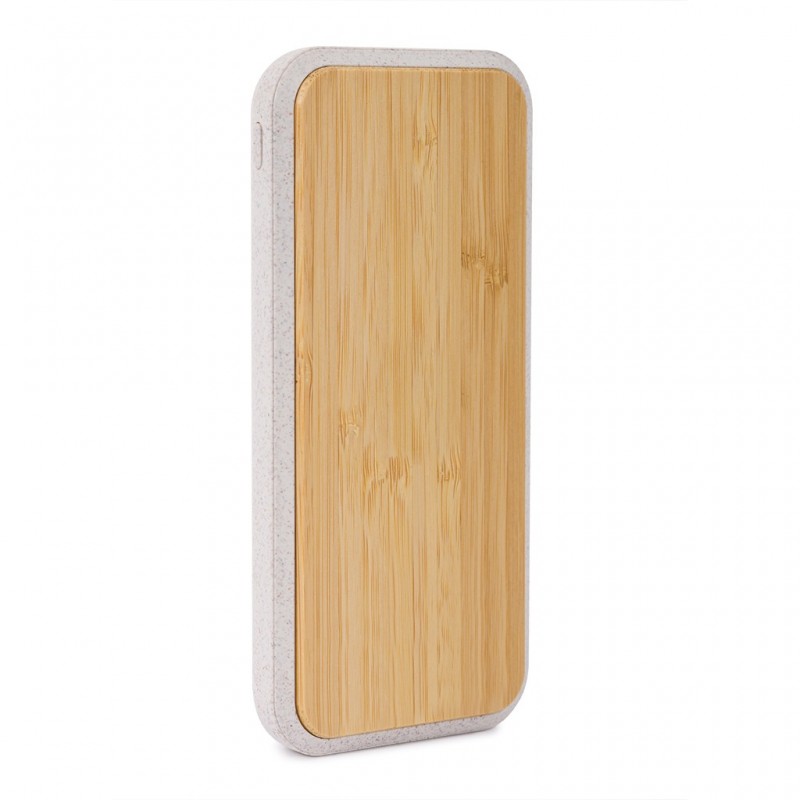 in paglia di grano e bambù, con batteria ricaricabile al Litio Polimero da 10000mAh e caricatore wireless (15W), adatto per smartphone di ultima generazione (compatibili con lo standard Qi wireless). Input/Output micro USB (tipo C) 5V/3A 9V/2.22A 12V/1.5A USB output 1 5V/4.5A 9V/2A 12V/1.5A USB output 2 5V/3A 9V/2A 12V/1.5A Munito di cavetto di ricarica micro USB (tipo C).