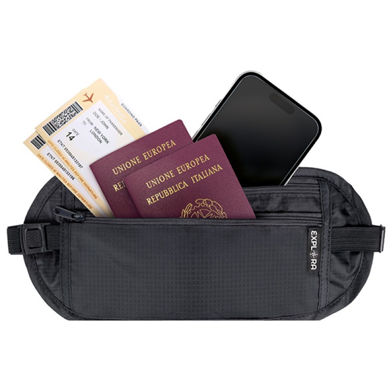 Cintura da viaggio in tessuto tecnico resistente all'acqua. Dotata di 2 scomparti con zip e fascia elastica regolabile. Ideale per contenere banconote, biglietti, documenti e telefono.