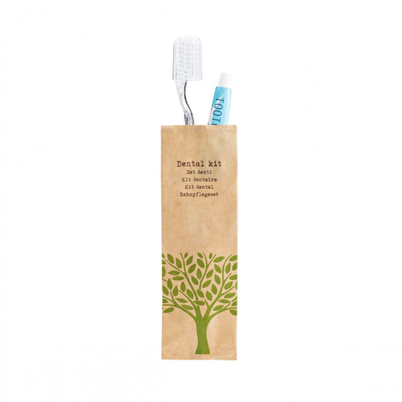 Set denti per Hotel composto da: spazzolino in PP trasparente e dentifricio da 7ml. Prodotto cosmetico monodose, per uso esterno.