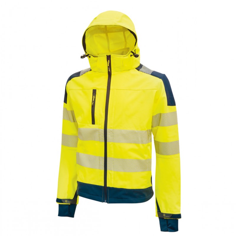 Giacca in tessuto Softshell, stretch, traspirante, antivento e idrorepellente. Due ampie tasche frontali chiuse con zip. Tasca porta cellulare su petto con chiusura zip, cappuccio staccabile con zip, maniche preformate , coulisse antimpigliamento regolabile all’interno della tasca, polsini regolabili con velcro e polsini antivento elasticizzato con buco per il pollice. Fondo sagomato. Strisce riflettenti termo-applicate su busto e braccia zip YKK. Conformità alle norme EN ISO 13688:2013 e EN ISO 20471:2013 + A1:2016.