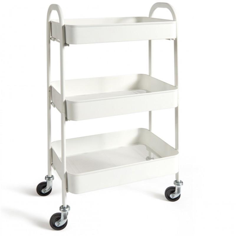 Carrellino in metallo verniciato bianco con 4 ruote girevoli e 3 ripiani. Ideali in cucina, bagno, lavanderia ecc. Si assembla velocemente senza bisogno di attrezzi. Dimensioni: L43 x P30 x H80cm.