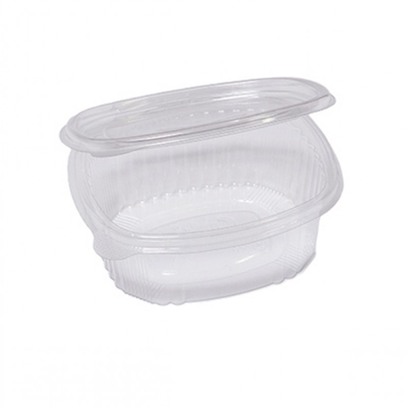 Contenitori ovali in PET con coperchio incernierato. Ideali per cibi freddi, con conservazione in frigo e freezer.