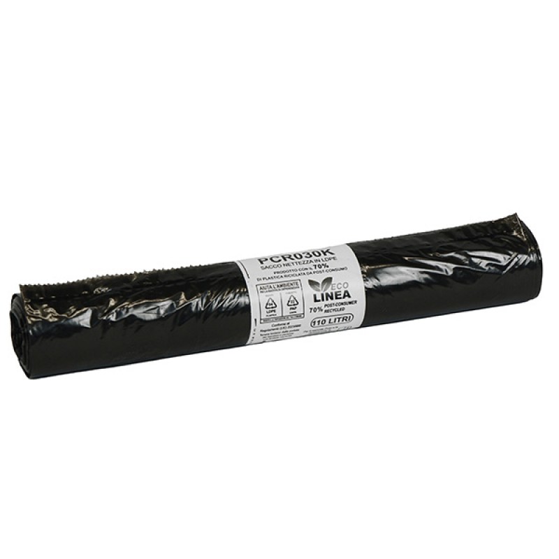 Sacchi in PCR creati con il 70% di plastica riciclata proveniente dalla racoclta differenziata domestica. Conforme alla direttiva (UE) 2018/852