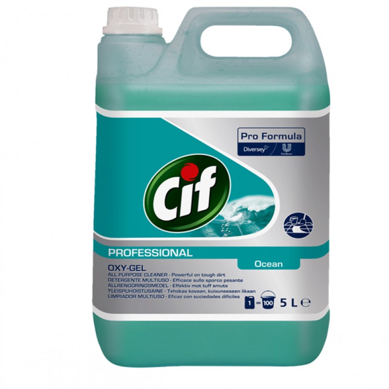 Gel con ossigeno attivo per i paviementi e tutte le superfici lavabili. Cif Oxy-Gel Professionale sviluppa microbollicine che aiutano a sollevare lo sporco mentre il gel lo rimuove velocemente e a fondo. Non necessita di risciacquo. Gradevole profumazione. Modalità d’uso: Uso diluito: per pulire i pavimenti e le grandi superfici, versare 20 ml di Cif Oxy-Gel Professionale per ogni litro d’acqua. Il gel si dissolve immediatamente nell’acqua. Non occorre risciacquare. Dosaggi consigliati: 80-160 ml di prodotto in 8 litri d’acqua a seconda del grado di sporco. Uso puro: per lo sporco difficile di bagno e cucina, versare Cif Oxy-Gel Professionale direttamente sulla superficie, lasciare agire per qualche istante e risciacquare con un panno umido.