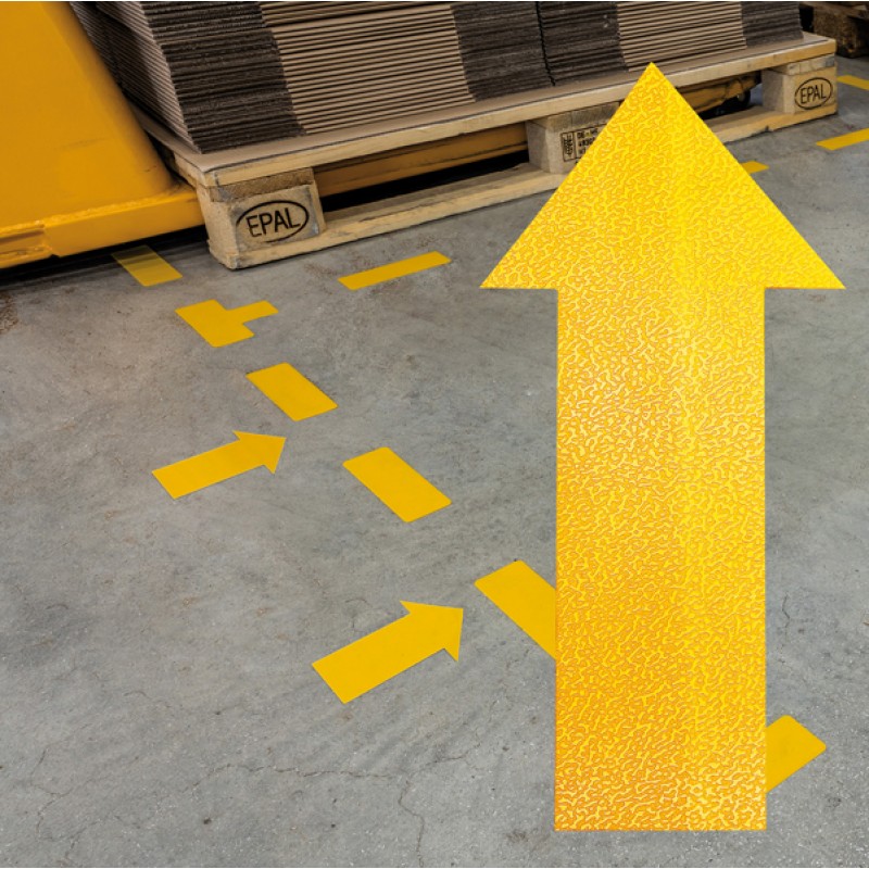 | Segnaletica da pavimento sagomata per l'individuazione di aree pericolose, spazi di stoccaggio, passaggi pedonali ecc. · Forma: "Freccia" · Simbolo adesivo per l'applicazione su pavimenti nelle aree interne · Robusto e resistente alle abrasioni · Resistenza allo scivolamento R9 conforme alla normativa DIN 51130 · Colore: RAL 1003 giallo segnale · Dimensioni: 100x200 mm, spessore 0,7 mm |
