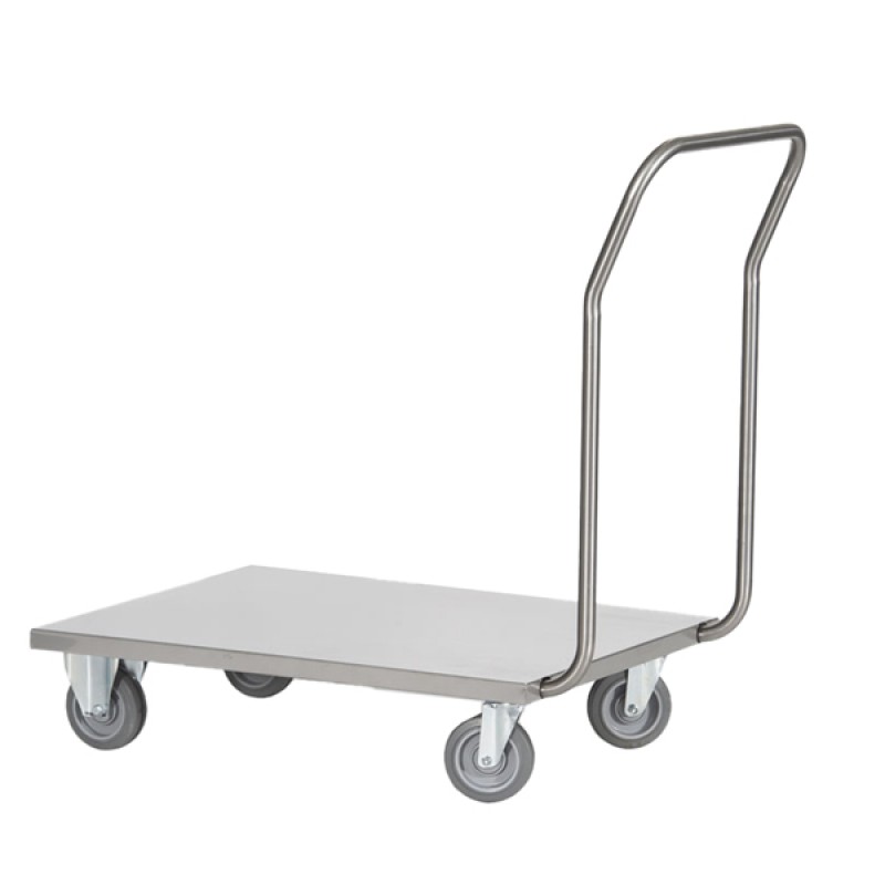 Carrello in acciaio inox AISI 304 a pianale. Manico ripiegabile montato sul lato corto e 4 ruote in gomma diametro 125cm, di cui 2 frenanti, anello in gomma grigia antitraccia, rotolamento su cuscinetti. Portata 120kg. Dimensioni carrello: 60Lx90Px97Hcm. Dimensioni pianale: 60Lx80Pcm. Fornito montato.