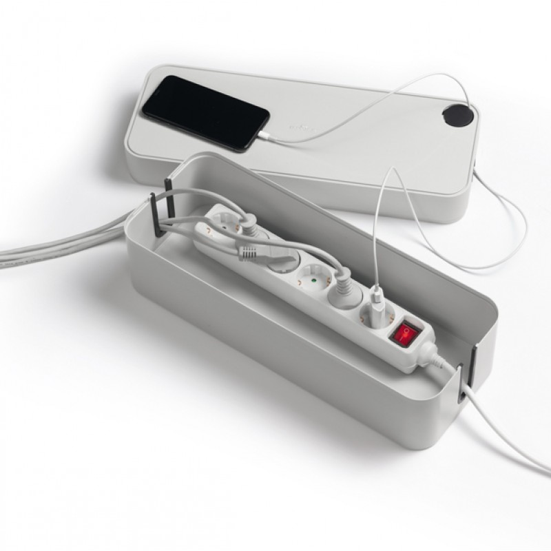 Scatola per nascondere cavi e multi prese da 5 entrate, realizzata in plastica ignifuga di alta qualità. Studiata per una gestione ordinata dei cavi, è dotata di fessure laterali che ne consentono il passaggio, inoltre facilitano la circolazione ottimale dell’aria. Il coperchio ha un’apertura passacavi circolare richiudibile ideale per cavi di ricarica dei telefoni cellulari.