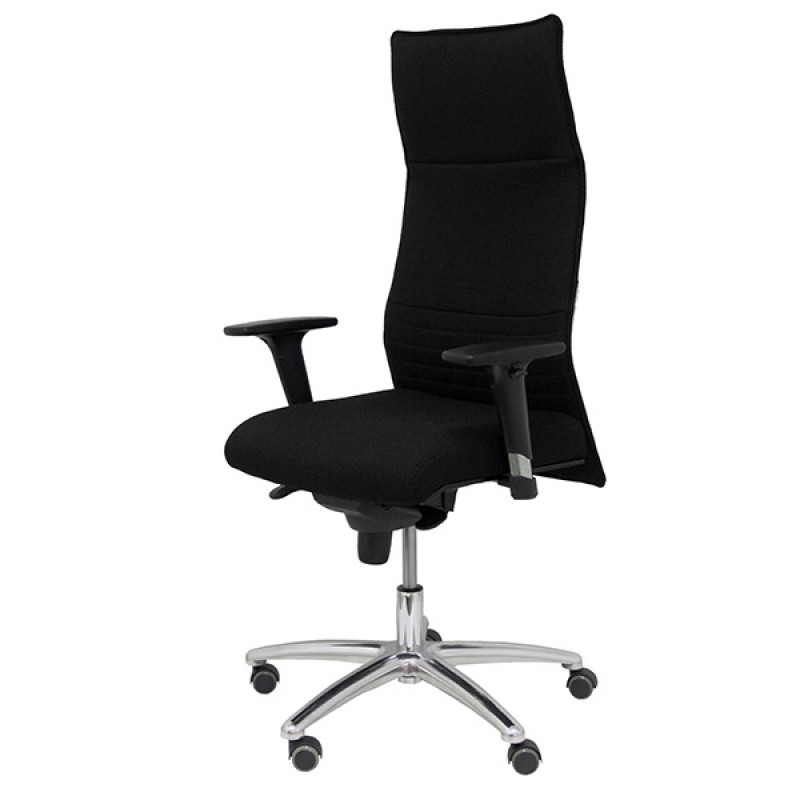 Poltrona direzionale girevole con elevazione a gas. Regolazione dell’inclinazione dello schienale e seduta con fissaggio a 5 punti. Imbottita in tessuto Bali nero. Braccioli regolabili in 1D e base in alluminio. Supporta un peso massimo di 160 kg. Altezza: 121-130 cm. Altezza sedile: 46-55 cm. Prof. Sedile: 44cm.