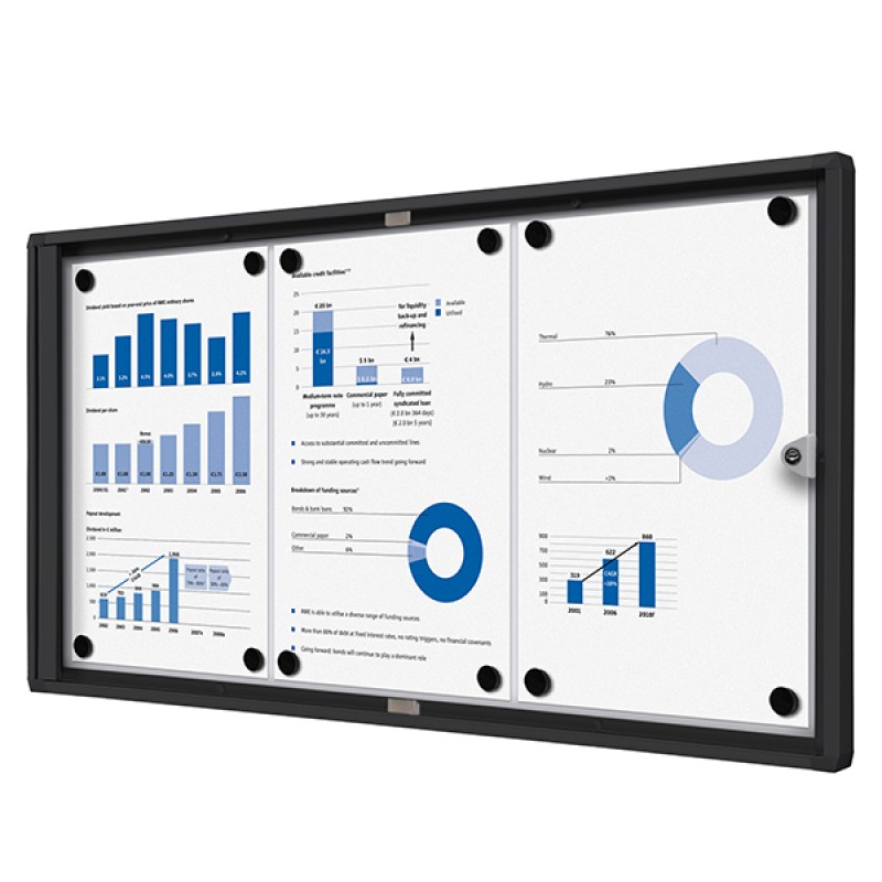 Bacheche per interni con cornice nera. Spessore 3mm e profondità interna di 12mm. Serratura a cilindro, con due chiavi in dotazione. Perfetta per uffici, scuole e spazi pubblici.