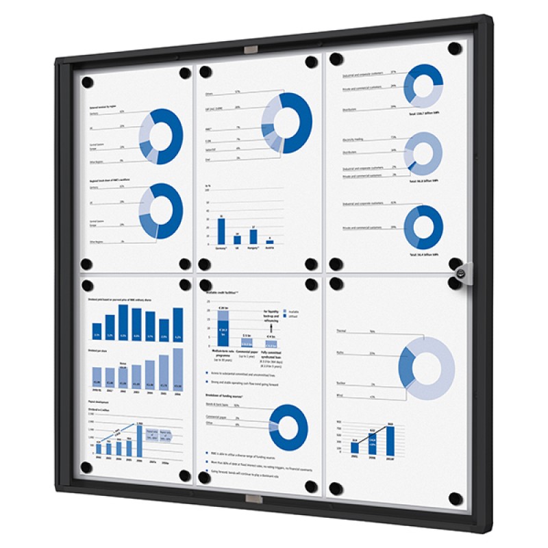 | Bacheche per interni con cornice nera. Spessore 3mm e profondità interna di 12mm. Serratura a cilindro, con due chiavi in dotazione. Perfetta per uffici, scuole e spazi pubblici. |