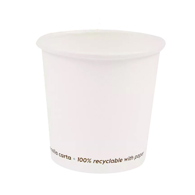 Bicchieri in cartoncino 100% fibre vergini accoppiato a polietilene (190+15 g/m2). Prodotto idoneo al contatto con alimenti secondo il regolamento CE n° 1935/2004 e successivi aggiornamenti. Prodotto conforme ai requisiti della Direttiva 94/62/CE per quanto riguarda il contenuto dei metalli pesanti. Non contiene sostanze sottoposte a restrizioni nelle legislazioni attualmente in vigore sui Food Contact Material. Prodotto realizzato con carta di pura cellulosa. Il prodotto è monouso. Conservare il prodotto in luogo asciutto e lontano da fonti di calore (0°C +35°C). Certificato FSC.