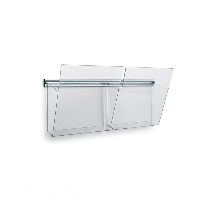 Barra in alluminio con tappini terminali grigi. e tappi di fissaggio. Completo di 2 tasche portadepliant vision A4 in polistirene trasparente neutro. Dimensioni (lxhxp): 50x14x25cm.