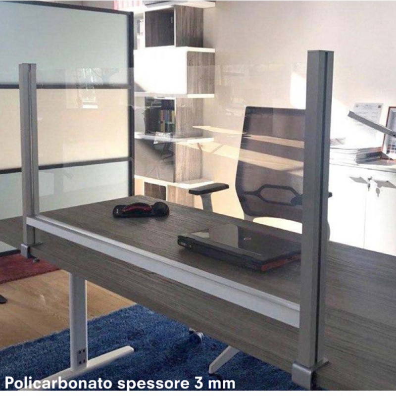 Schermo di protezione L102xH60cm realizzato da un telaio in alluminio anodizzato silver, lega EN AW 6060-T5. Il telaio composto da un profilo estruso con sezione 2,5x5cm. Lo schermo è realizzata in policarbonato trasparente 100x50cm - spessore 3mm, certificato in classe EN 1350-1, ed ha un’eccellente resistenza meccanica e agli urti. Gli schermi possono essere fissati alla scrivania tramite morsetti idonei per ripiani di spessore 2-3,5cm. La parete inferiore dello schermo è sollevata per lasciare uno spazio passacarte.