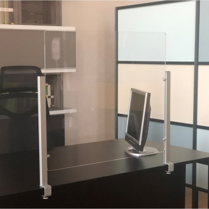 Schermo di protezione realizzato con montanti in alluminio estruso anodizzato silver. Il pannello dello schermo è in metacrilato L100xH59,8cm spessore 5mm sagomato con filo lucido, sorretto da morsetti laterali in alluminio; può essere posizionato liberamente in altezza in modo da lasciare sotto uno spazio passacarte. Lo schermo si fissa alla scrivania tramite morsetti idonei per ripiani di spessore 1,8-3,3cm.