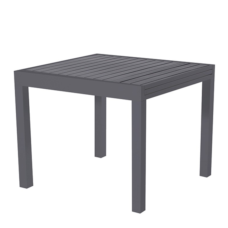 Tavolo allungabile in alluminio verniciato con top a doghe. Apertura a scorrimento. Articolo da montare. Abbinabile alle sedute sardegna: cod 105628 105629. Dimensioni: 90-180 x90 x74cm