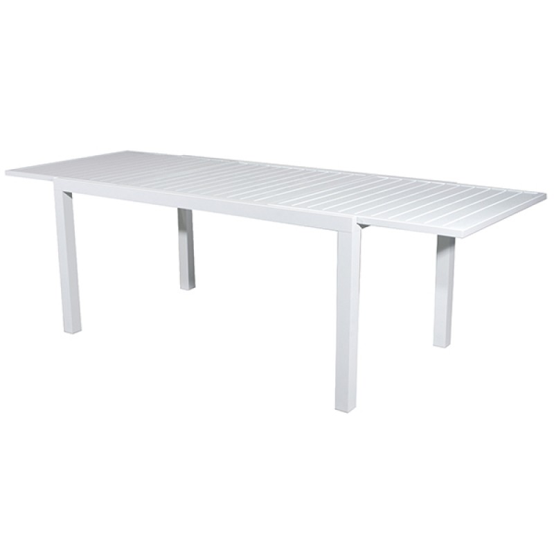 Tavolo allungabile in alluminio verniciato con top a doghe. Apertura UP/DOWN. Articolo da montare. Abbinabile alle sedute sardegna: cod 105628 105629 Dimensioni: 160/240 x 100 x 74cm